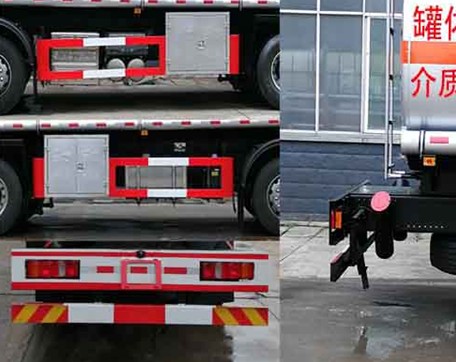 該車為危險品車輛,危險貨物運輸車輛的類型為FL型,類項號:3;罐體有效容積:24.3立方米,介質:原油,乙醇,密度(千克/立方米)分別為:800,800;罐體尺寸(長×長軸×短軸)(mm)為:8800×2400×1660,8800×2250×1560;側、后防護均采用Q235材質螺栓連接在大梁上,后防護裝置斷面尺寸為(mm):140×50,后部防護離地高度:430mm;ABS系統型號為4460046300,生產企業為威伯科汽車控制系統(中國)有限公司;ABS系統控制器生產企業/型號為威伯科(上海)管理有限公司/4460046300;選裝EBS,EBS系統控制器生產企業/型號為威伯科(上海)管理有限公司/EBS3;隨底盤選裝駕駛室;安裝限速裝置,限速80km/h,排氣管前置,前輪盤式制動器;安裝具有衛星定位功能的行駛記錄儀,轉向輪裝備輪胎爆胎應急防護裝置;發動機型號及油耗值(L/100km)為:MC07.31-60(38.2),MC07.34-60(38.2).