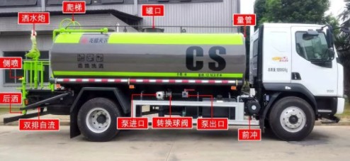 罐體采用4mm厚碳鋼板制作,容積約14立方米,配杭州威龍水泵(可泵進(jìn)泵出),帶前沖、后灑、側(cè)噴,罐體右側(cè)靠尾部帶兩個(gè)高位花灑,后工作平臺(tái)為沖孔平臺(tái),防滑式踏板,帶綠化灑水高炮,水位計(jì),球閥式消防栓接口和DN65泵進(jìn)出口裝在副駕駛一側(cè),正駕駛尾部一個(gè)球閥式消防栓上水口(管道伸入罐體內(nèi)2/3高度位置),正駕駛尾部一根直徑65與后保險(xiǎn)杠等長(zhǎng)的噴水管(直徑65的管鉆兩排孔朝下噴水),整車全通徑球閥,主管道直徑80,其余出口為65,一個(gè)工具箱,后尾部管道左右各一個(gè)1寸的洗手閥,罐尾左右各一個(gè)圓警燈,兩根與罐體等長(zhǎng)的輸水管,其余為工廠標(biāo)準(zhǔn)配置。