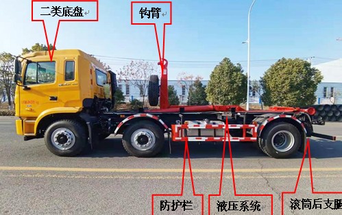 CLW5240ZXX6HH型車廂可卸式垃圾車是在二類汽車底盤的基礎上,加上鉤臂、液壓系統、防護欄、連接附件等裝置組成,具體如下: