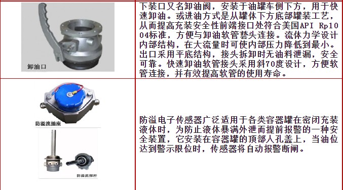 ![]() ![]() 油罐車(chē)歐標(biāo)系統(tǒng):歐標(biāo)罐口、海底閥,油氣回收閥,防溢流探桿探座,卸油閥。
